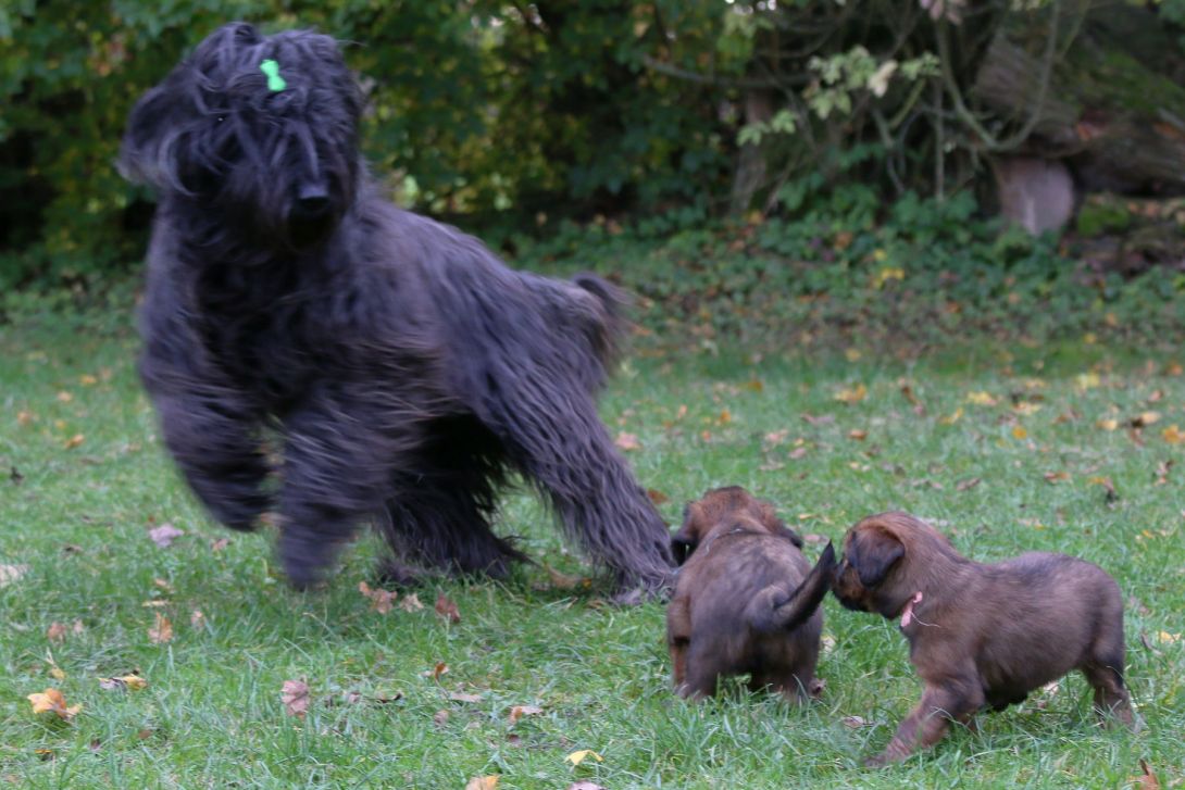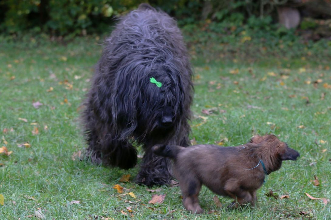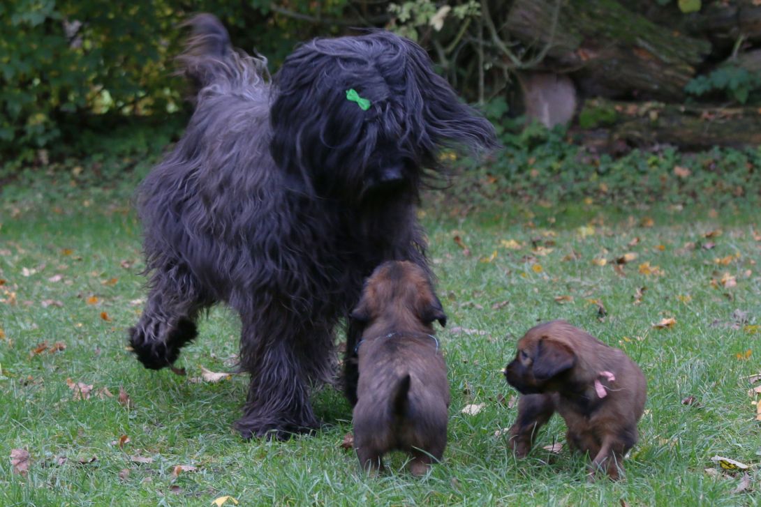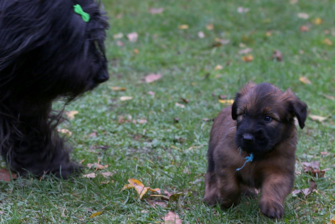 ... scheint das kleine Briardmädchen (Fräulein Bronze) zu denken, als Edana mit ihr spielen will und sie neugierig betrachtet. Schnell läuft sie weg, aber zum Glück kommt ihr ihr Bruder, Herr Türkis zu Hilfe, stellt sich dem gefährlichen Großmutter-Monster mutig entgegen und schafft es sogar sie für einen Moment zu vertreiben. Aber so ganz allein wird ihm doch ein wenig Bange und schnell rennt er zu seinen Geschwistern, für die es natürlich nichts spannenderes gibt, als nun gemeinsam mit ihrer Oma zu spielen.
