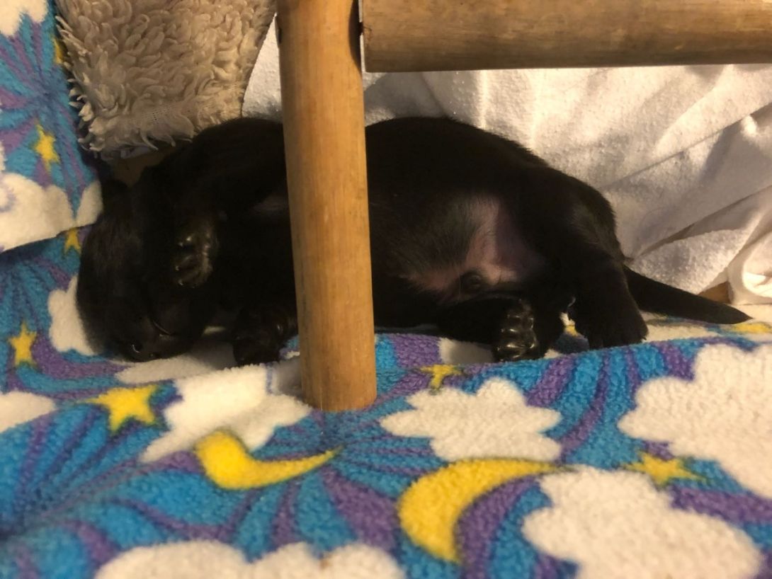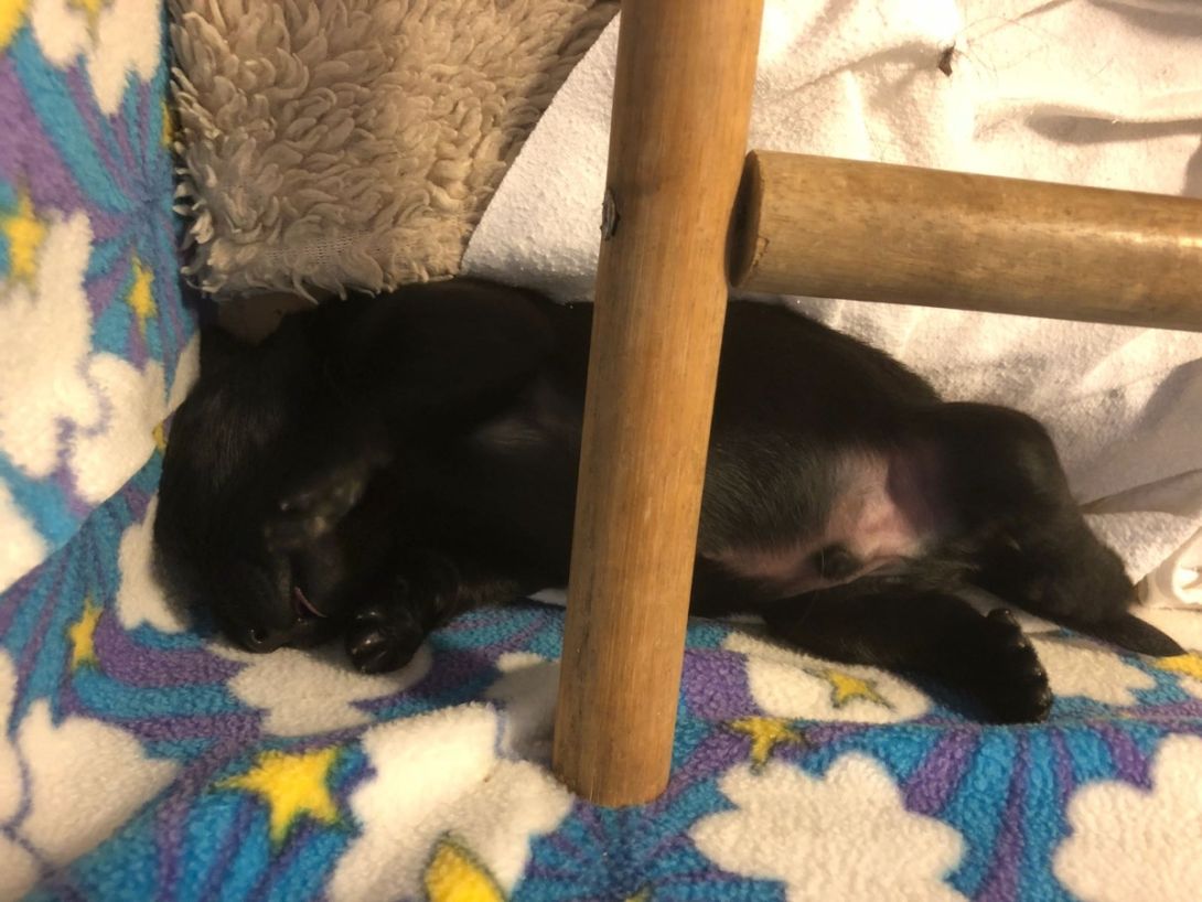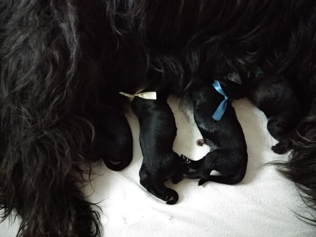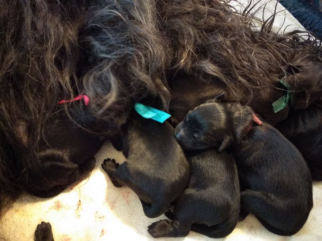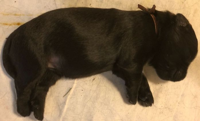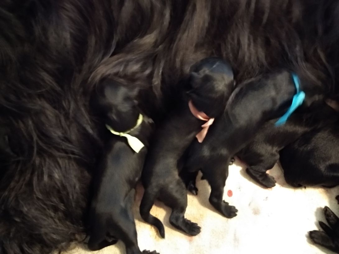 Es ist ein sehr einheitlicher Wurf. Zum einen was das Geburtsgewicht betrifft (nur ein Rüde ist deutlich leichter). Zum anderen die Farbe: alle sind schwarz -- wäre da nicht ein "anders schwarzer" Rüde, der es noch spannend macht. Erst dachten wir, es sei das schummrige Nachtlicht. Doch auch bei Tag betrachtet sieht er anders schwarz, eher tiefdunkelbraun aus. Mal sehen, was daraus wird. Einheitlichkeit gab es, was die Geschicklichkeit und Geschwinkdigkeit betrifft, mit der die kleinen Zwerge den Weg zur Zitze finden, allerdings getrennt geschlechtlich, sozusagen. Während die Jungs alle ein wenig verpeilt waren und erst lernen mussten, dass man zum Ansaugen vielleicht auch das Mäulchen öffen und obendrein auch noch mit den Beinchen treten sollte, waren die Mädels blitzeschnell am Treten-Saugen-Schmatzen-Schlucken. Sie hatten auch vor dem ersten Ansaugen schon raus, dass das Mäulchen nicht nur zum Saugen, sondern auch zum lautstarken Mitteilen von Unmut gut ist. Manchmal werden Stereotype halt doch wahr!