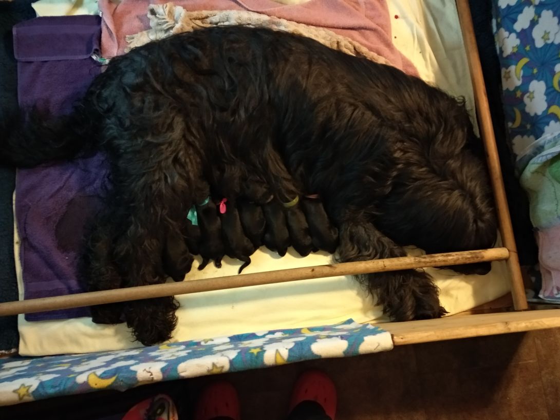 Eine Geburt ist immer eine anstrengende Angelegenheit - aber bei dieser Hitze noch viel mehr! Gwen hat es schlauerweise so eingerichtet, das bisschen Abkühlung, das die Abend- und Nachtstunden bringen, zu nutzen. Los ging es am Abend des 1. August und bei Sonnenaufgang lagen 9 schwarze Welpen, 6 Rüden und 3 Hüdinnen in der Wurfkiste. Außer diesen wurde ein Rüde und eine Hündin leider tot geboren. Leben und Tod liegen nah bei einander. Um so mehr freuen wir uns über die putzmuntere 9er-Bande!