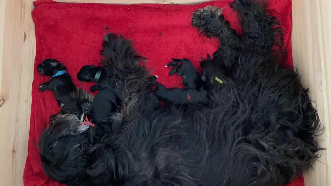 ​Am Freitag den 15.10.2021 um 4.01 Uhr ging es los und Talulah unser Wirbelwind , hatte es wie immer eilig, den in nur 130 Minuten waren alle sechs Welpen auf der Welt, Drei stramme Buben mit einem Gewicht von  325, 324 und 343 Gramm und drei Mädels mit 321, 259 und 226 Gramm. Alle waren gleich munter und auf dem Weg zur Milchbar. Um 6.15 nachdem der letzte Welpe geboren war, warteten wir trotzdem noch drei Stunden den laut Ultraschall wurden ja mehr Welpen gesehen. Da aber keiner mehr kam ließen wir zur unserer Beruhigung ein Röntgenbild machen, kein Welpe mehr drin, also alles gut,