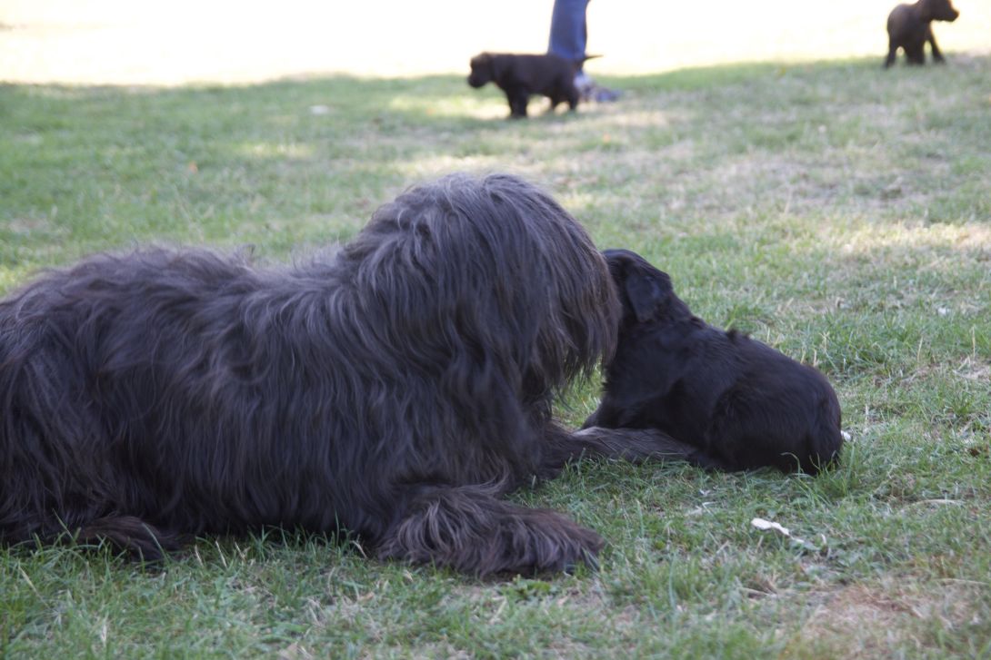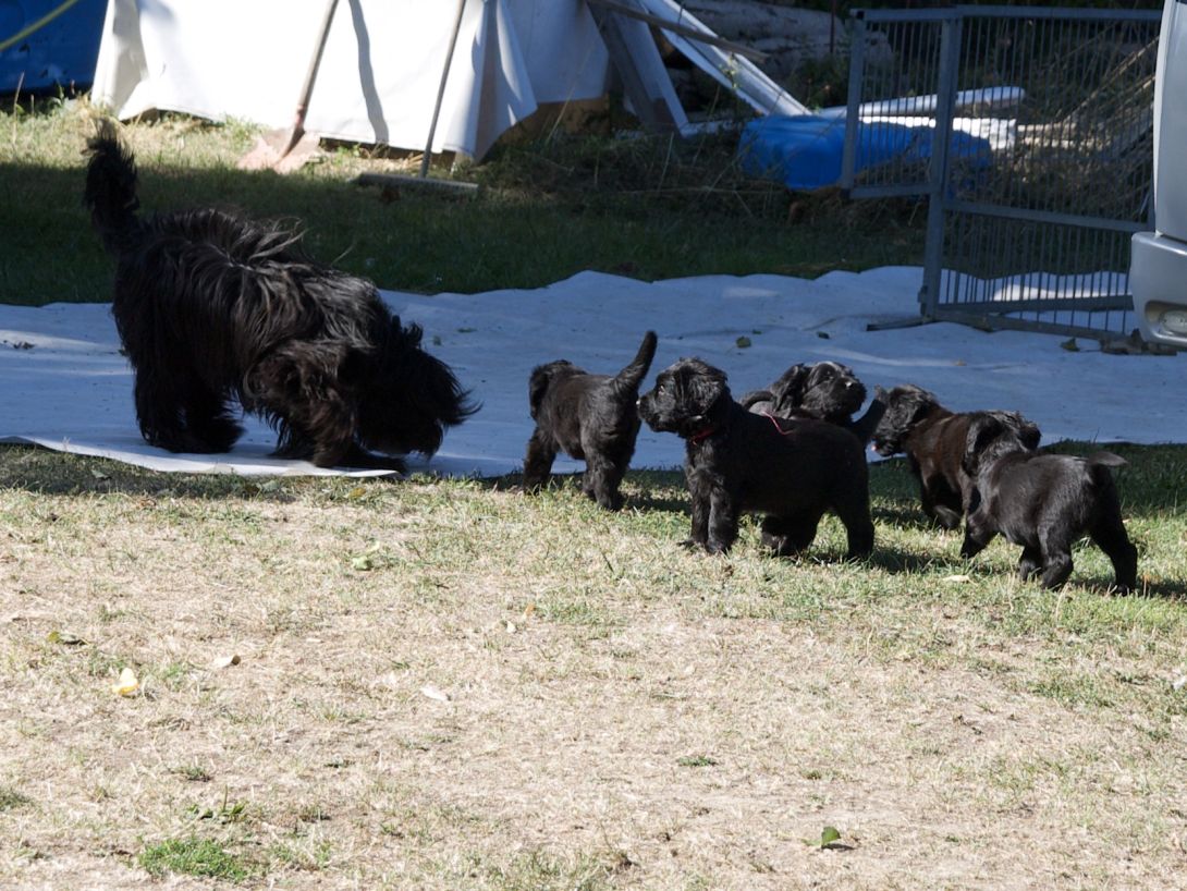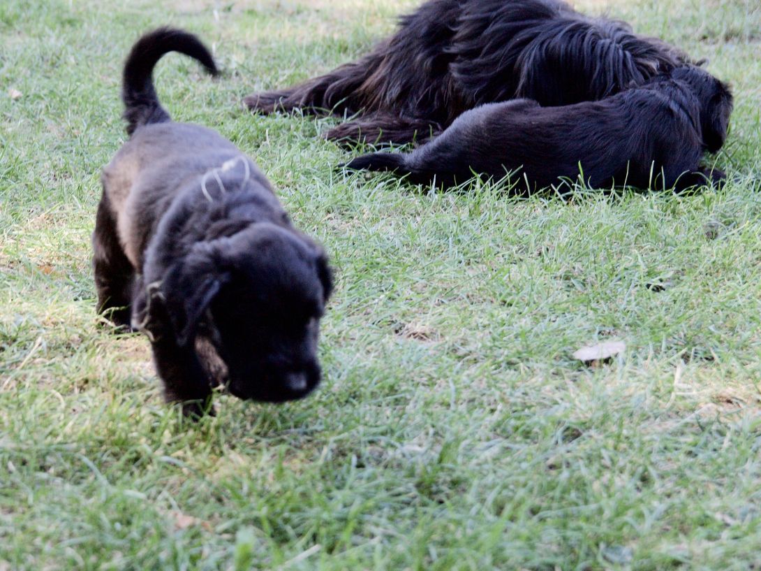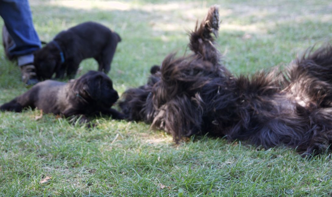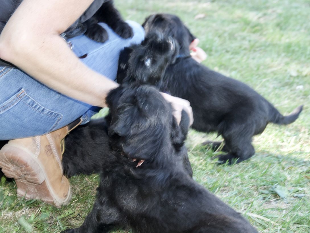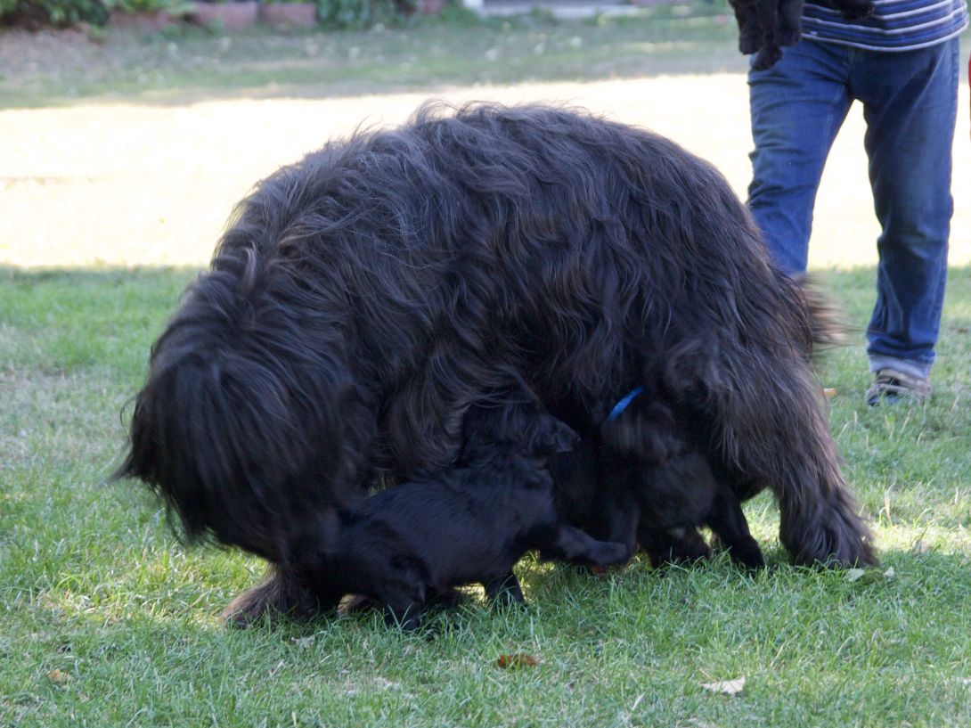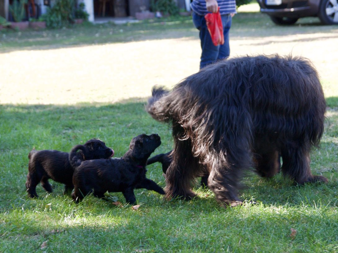 Happy war auch dabei, allerding fand Sie es nicht so toll, dass wir an ihre Zitzen wollten.Besuch war auch wieder dabei und Sie fanden uns richtig toll. Einer unserer Brüder darf dann in den Taunus ziehen und als Reitbegleithund Karriere machen. Wir bekommen nun zur Muttermilch auch zwei Fleischmahlzeiten und eine Breimahlzeit, was uns richtig gut schmeckt.Zu Hause angekommen, mußten wir erst einmal eine Runde schlafen