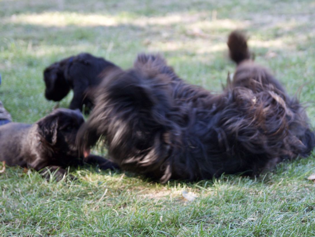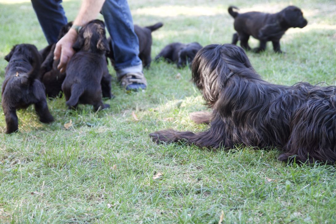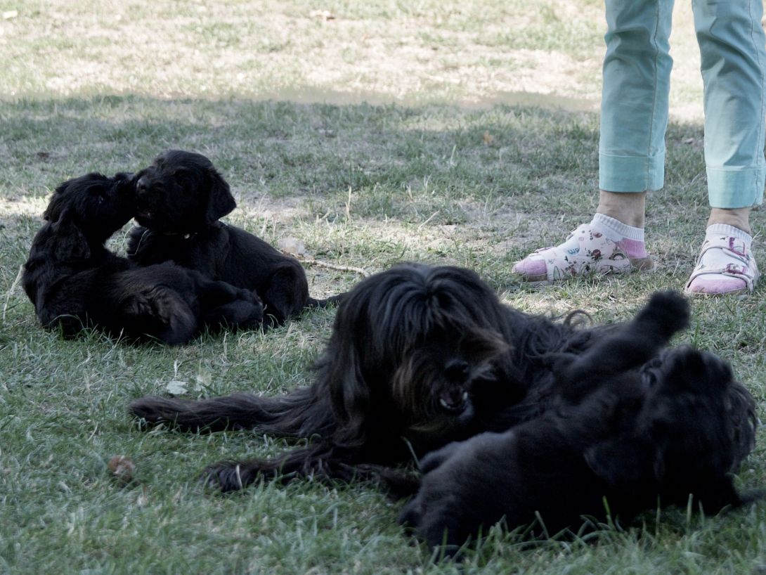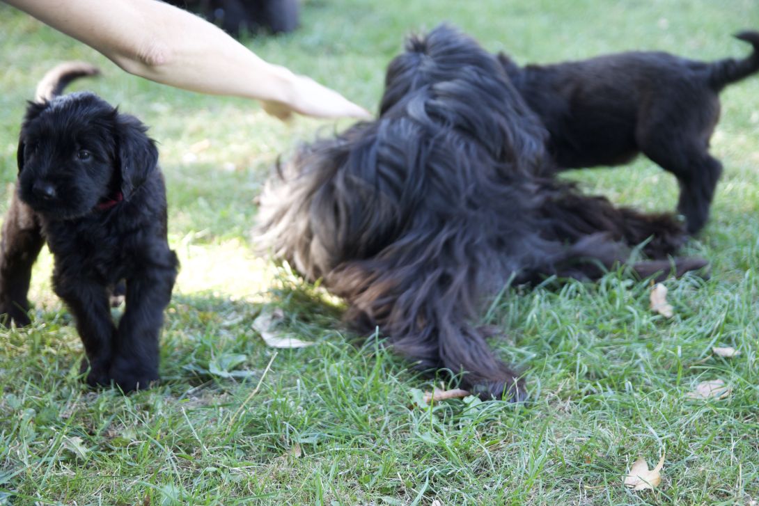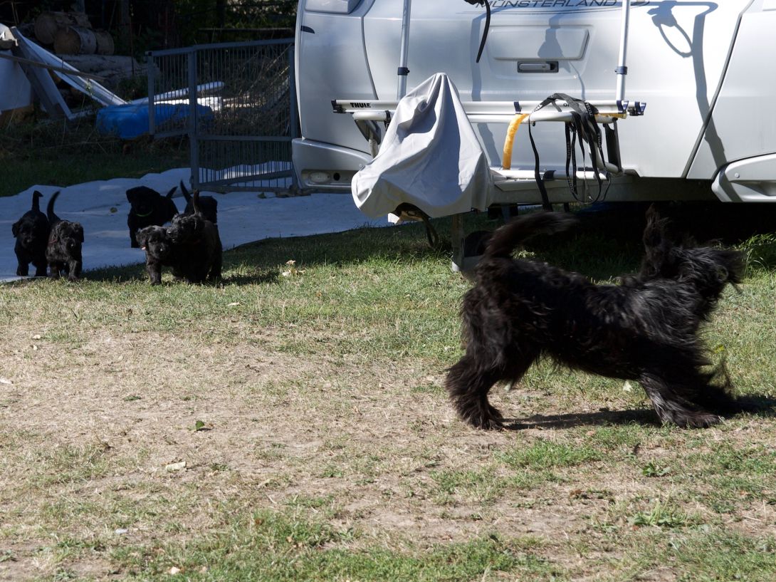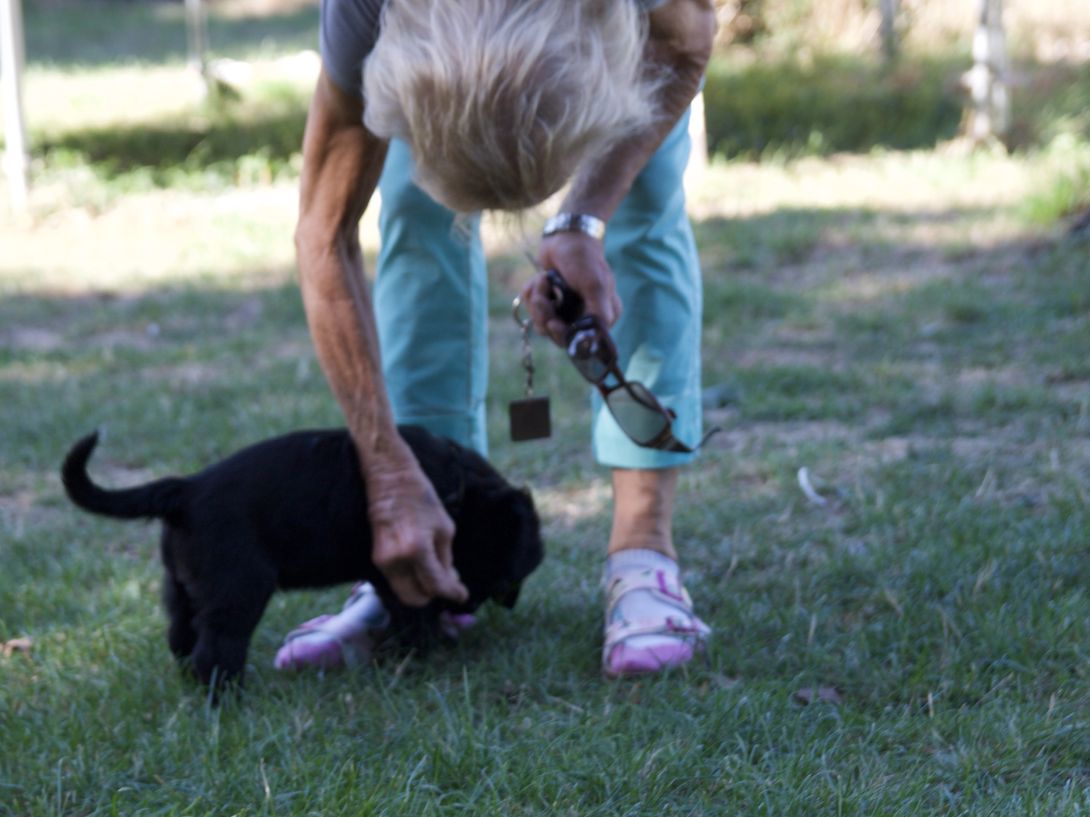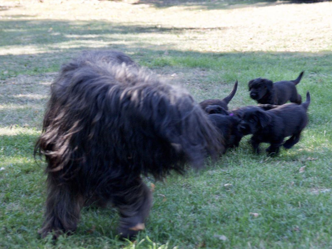 Happy war auch dabei, allerding fand Sie es nicht so toll, dass wir an ihre Zitzen wollten.Besuch war auch wieder dabei und Sie fanden uns richtig toll. Einer unserer Brüder darf dann in den Taunus ziehen und als Reitbegleithund Karriere machen. Wir bekommen nun zur Muttermilch auch zwei Fleischmahlzeiten und eine Breimahlzeit, was uns richtig gut schmeckt.Zu Hause angekommen, mußten wir erst einmal eine Runde schlafen
