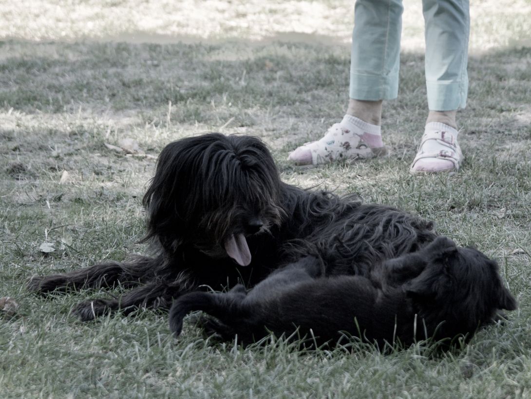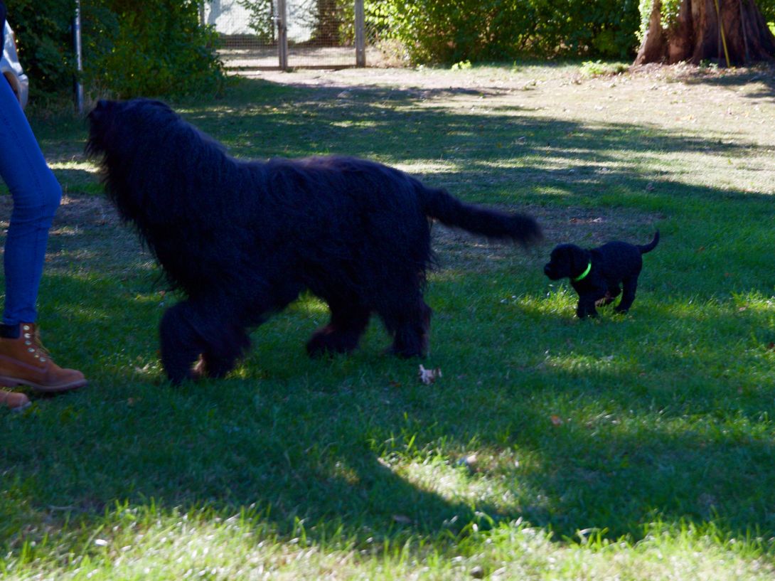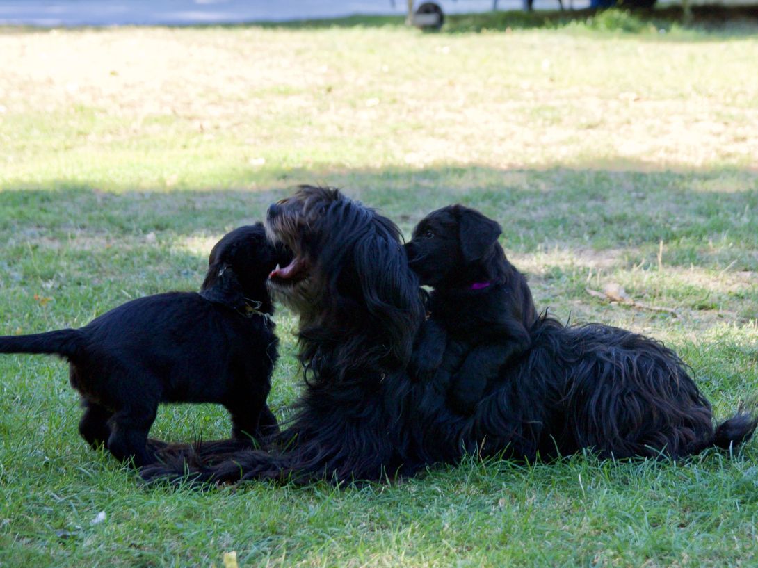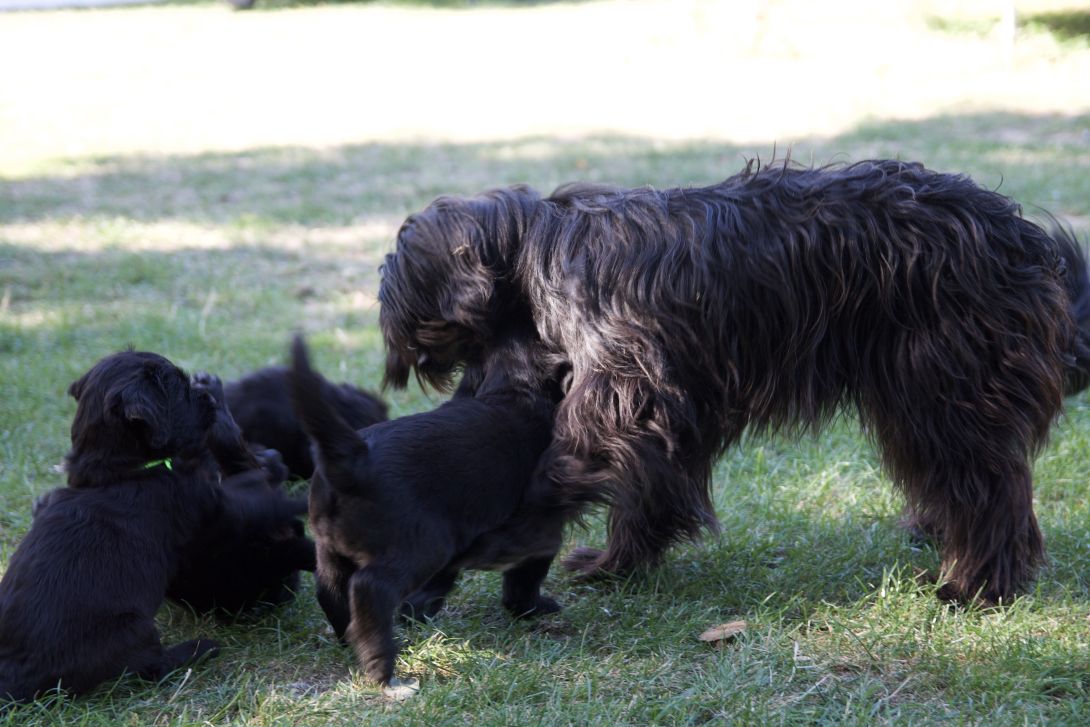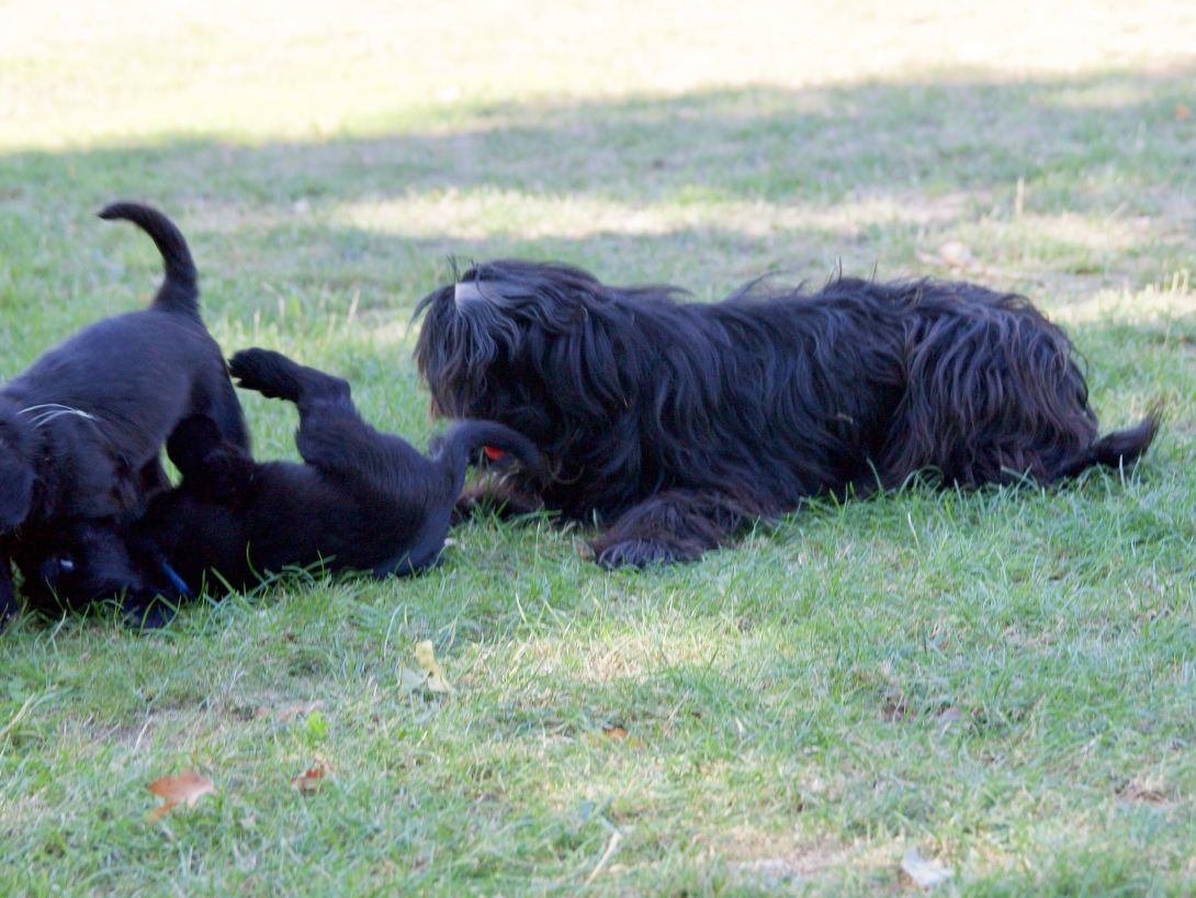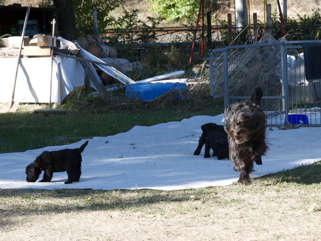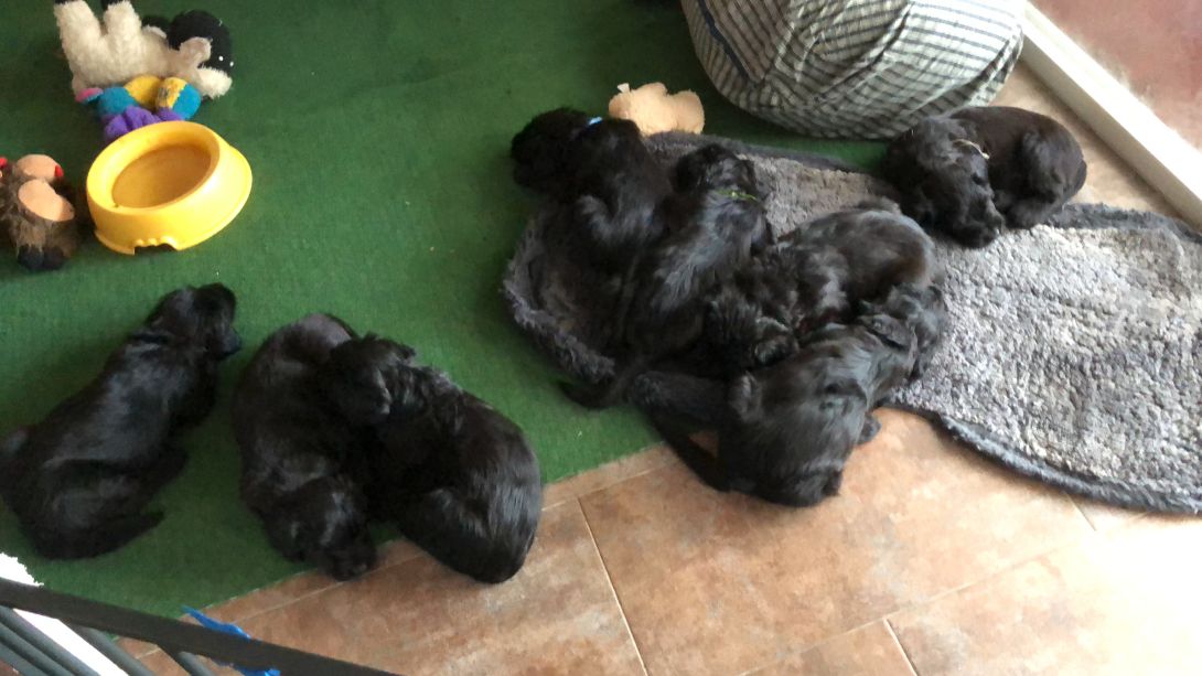 Happy war auch dabei, allerding fand Sie es nicht so toll, dass wir an ihre Zitzen wollten.Besuch war auch wieder dabei und Sie fanden uns richtig toll. Einer unserer Brüder darf dann in den Taunus ziehen und als Reitbegleithund Karriere machen. Wir bekommen nun zur Muttermilch auch zwei Fleischmahlzeiten und eine Breimahlzeit, was uns richtig gut schmeckt.Zu Hause angekommen, mußten wir erst einmal eine Runde schlafen