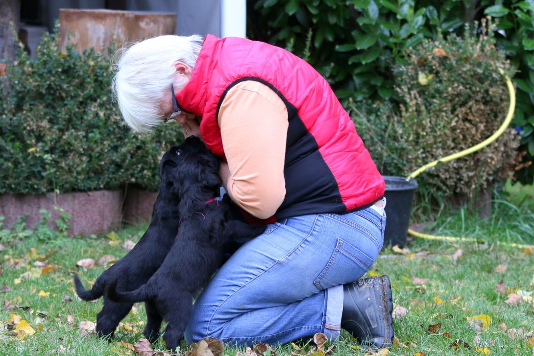 Nun sind wir schon sechs Wochen alt und haben schon einiges erlebt. Am letzten Wochenende kamen natürlich unser Haus und Hof Fotograf Thomas mit Sabine und Susanne und hat uns wieder ganz toll ins Bild gesetzt, dafür vielen Dank. Außerdem kamen natürlich wieder einige unserer zukünftigen Dosenöffner und haben uns beschmust und gekuschelt. Wir waren auch an allen Tagen wieder im großen Garten, das Wetter war natürlich wie für uns gemacht. In dieser Woche hat sich wieder neuer und alter Besuch angesagt. Wenn alles klappt, mit dem neuen Besuch, dann sucht nur noch einer unsere schwarzen Brüder und eine schwarze Schwester ihre eigene Familie. Unser Papa will uns auch besuchen, der wird schauen, was wir gewachsen sind. Was gibt es noch zu berichten, ja Morgen kommt eine 'Schulklasse von zweit Klässlern, denen werden wir Beine machen. Wir sind alle gut drauf und lernen jeden Tag noch etwas Neues dazu. Ach ja Autofahren hat bisher bei keinem Übelkeit ausgelöst, hoffen mal es bleibt so. Nun bis nächste Woche es Grüßen die H-Gang mit den Versorgern